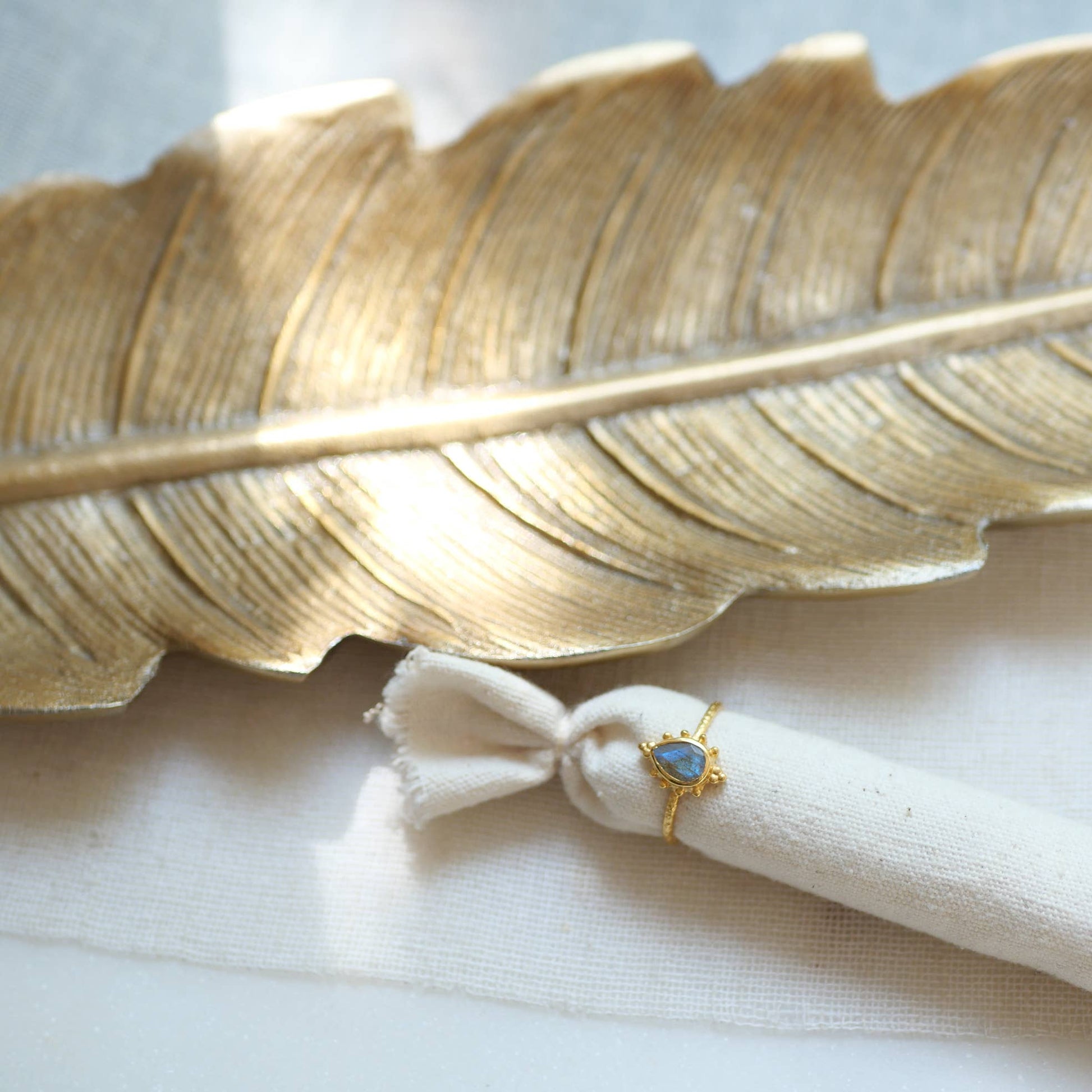 This adjustable ring is gold-plated and set with a stunning labradorite, making it a unique and charming addition to any jewelry collection.