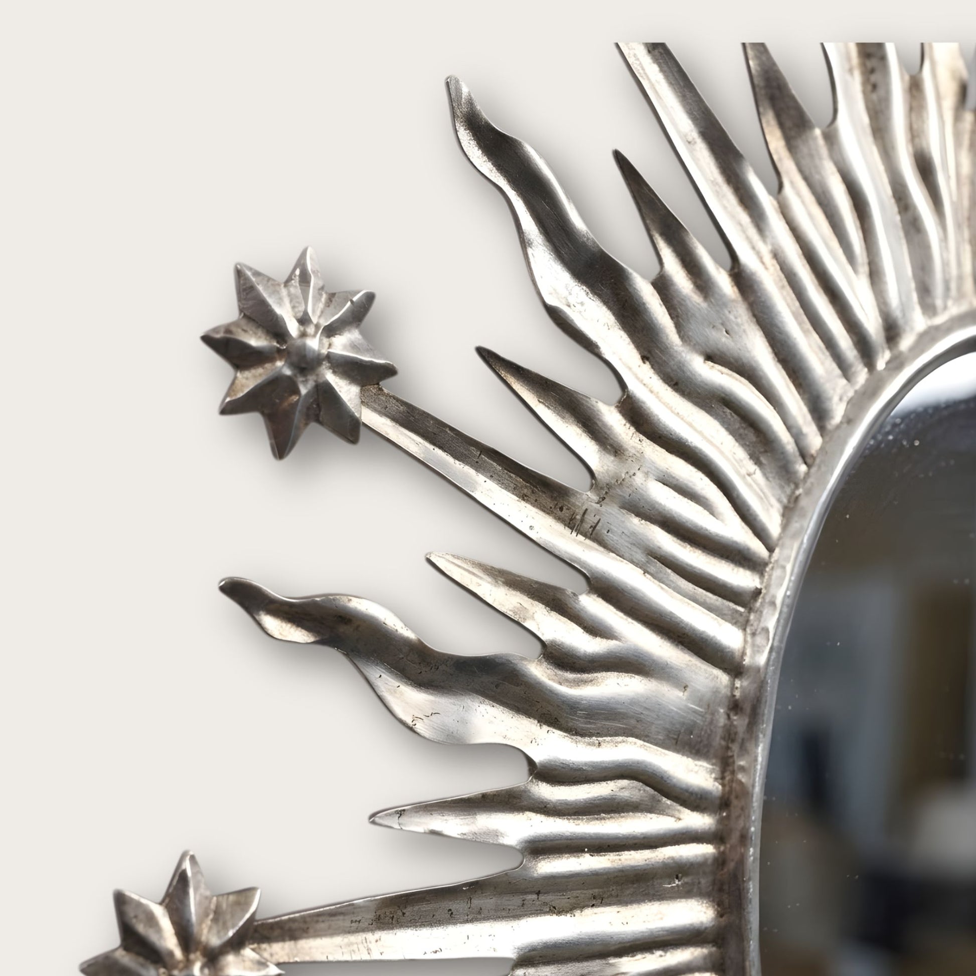 Handcrafted from metal with an antiqued gold finish, this celestial wall mirror captures and reflects light with a soft, radiant glow. Surrounded by rings of stars, it makes a celestial statement, adding a sense of wonder and vintage elegance to any room.