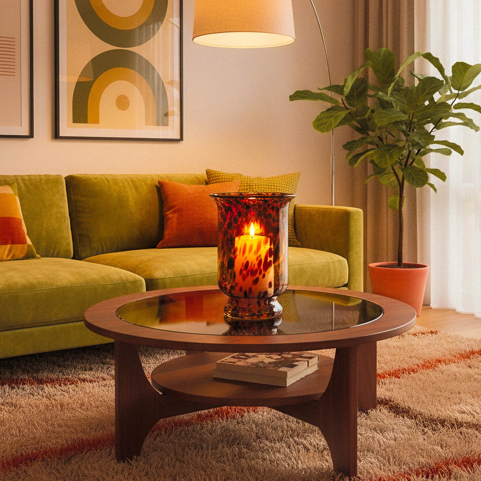 This glass vase features a striking black and amber tortoiseshell design. Its large size suits consoles, dining tables, or mantels, whether used for flowers, dried arrangements, or as a sculptural accent. The hurricane shape of the vase makes it perfect for candles. The warm, organic colours and versatile shape works well in both modern and classic interiors, making it an ideal choice for bold, nature-inspired home décor.