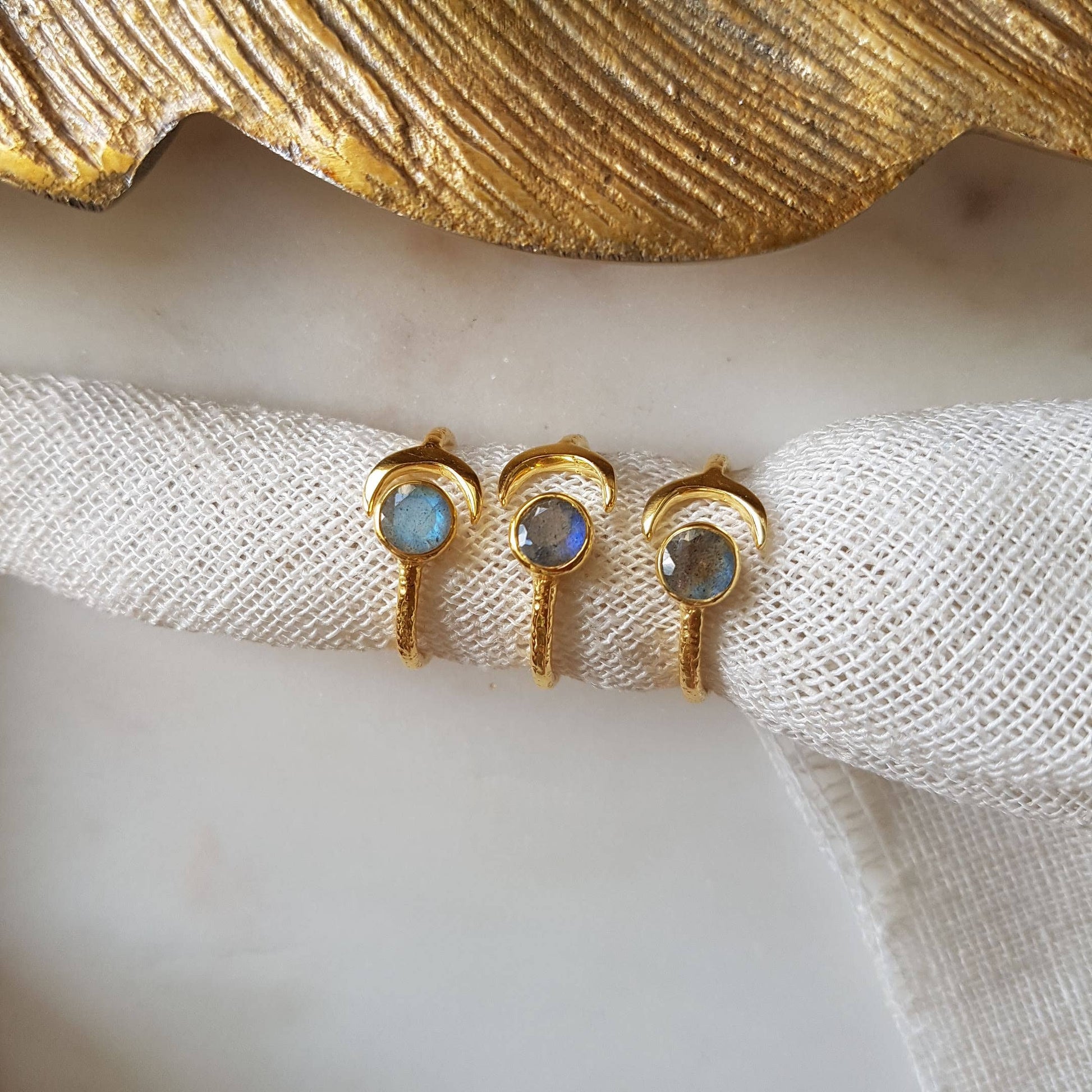 2 micron gold plated ring adjustable from size 54 to 60, with a labradorite Smooth" moon, hammered ring contour