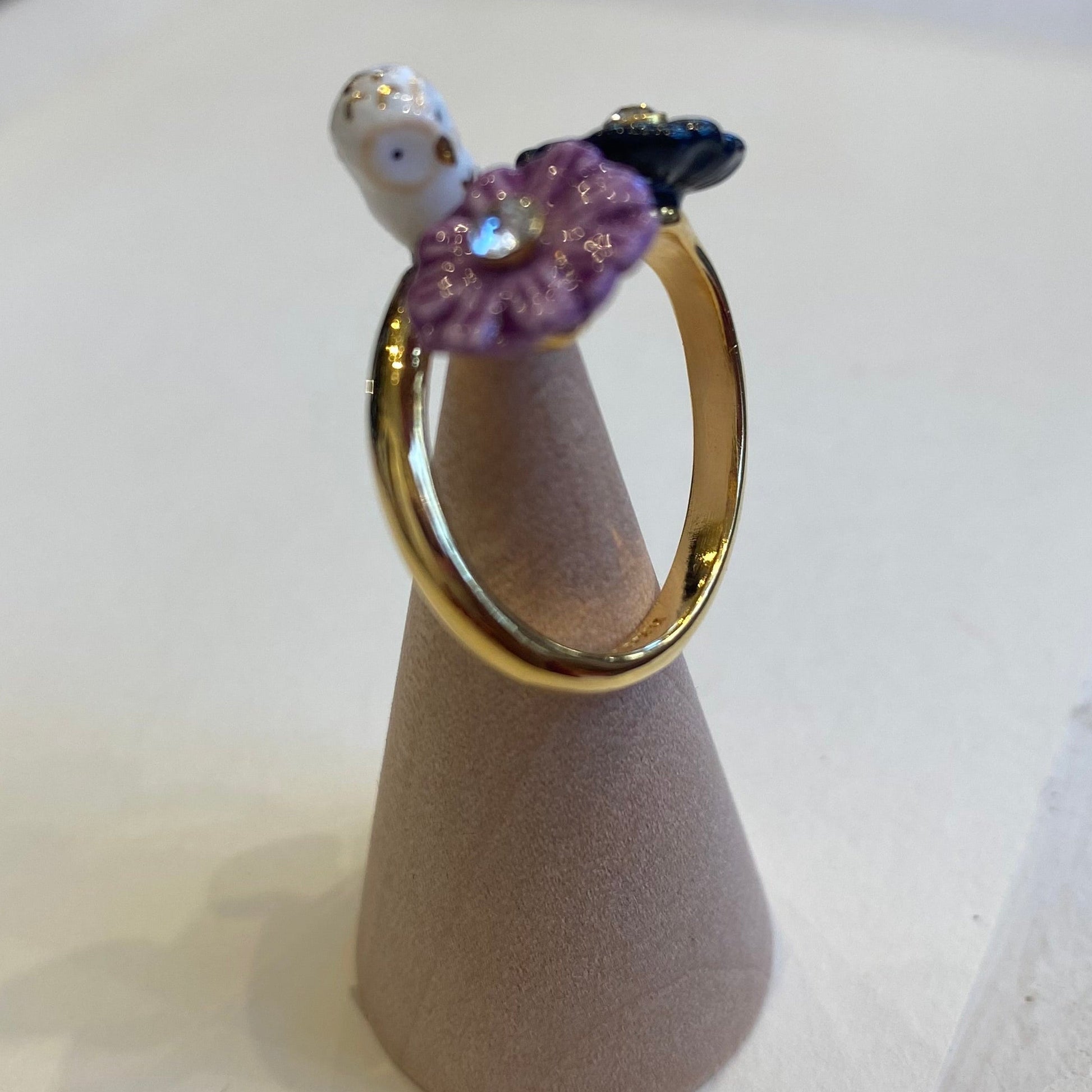 Discover the artistry of handcrafted elegance with this adjustable porcelain ring, where delicate white owl and aster flower motifs meet refined metalwork. Each piece is individually sculpted and painted, ensuring no two rings are identical. Crafted from premium porcelain paired with gold-plated brass, this design celebrates natural imperfections as marks of authenticity. The nickel-free, hypoallergenic metal ensures comfort for sensitive skin, making it a jewel you'll treasure for years to come.