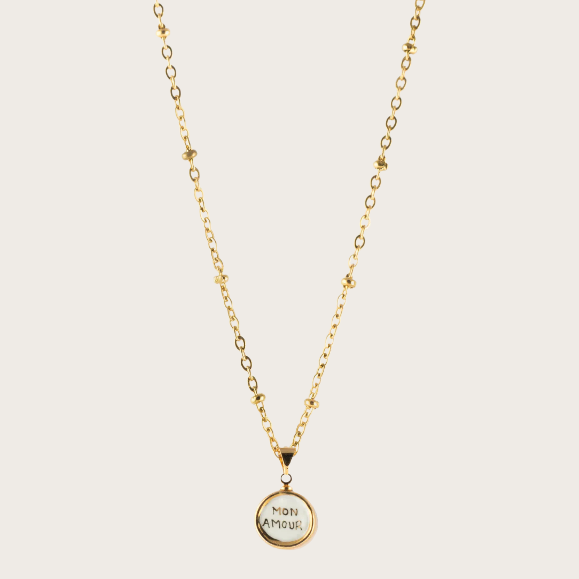 Handcrafted porcelain paired with delicate glass beads and gold-plated brass creates a necklace that celebrates meaningful connection. This delicate necklace from Nach features a pendant, with a reversible design. On one side reads, 'Mon Amour' and the other a single love heart. Each piece is individually painted, ensuring no two are identical—those subtle variations are what make it genuinely precious. The nickel-free, hypoallergenic metal sits gently against your skin, while the artisanal finish speaks to quality that transcends fleeting trends. A wearable reminder of love, crafted with intention.