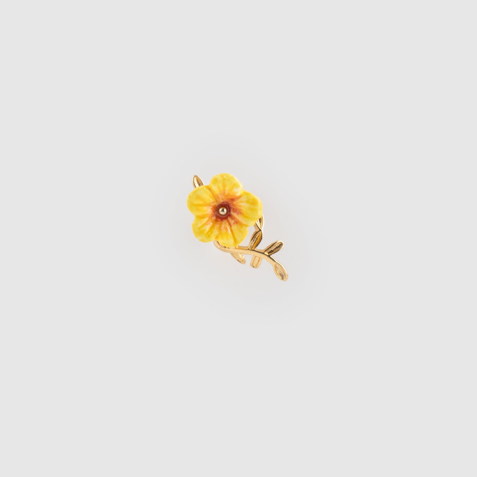 Delicate yellow hibiscus bloom captured in hand-painted porcelain, set in fine gold-plated brass sourced from Italy. This ear cuff earring celebrates artisanal craftsmanship, each piece is entirely unique, with subtle irregularities that speak to its handmade origins. Nickel-free and hypoallergenic, it's designed for sensitive skin. At just 1g and 2.2 cm in length, it cuffs gracefully without weight. Perfect for those who value wearable art and ethical, premium materials.