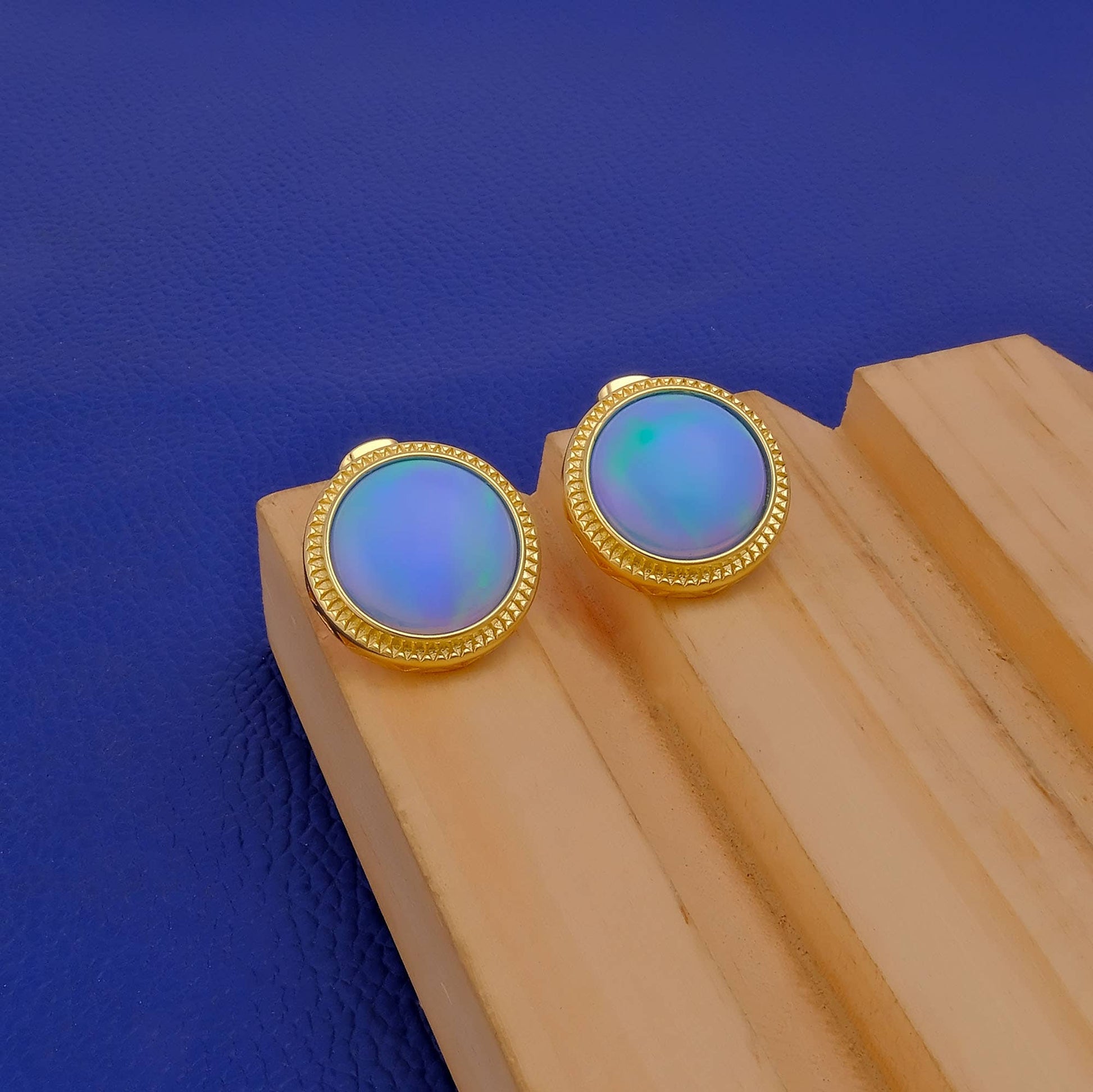 These Blue Opal stud earrings, handcrafted with care. Each round cabochon stone is set in gold-plated brass, giving a timeless and elegant finish. The iridescent glow of Blue Opal makes these earrings a meaningful piece and a versatile accessory for daily wear or special occasions.