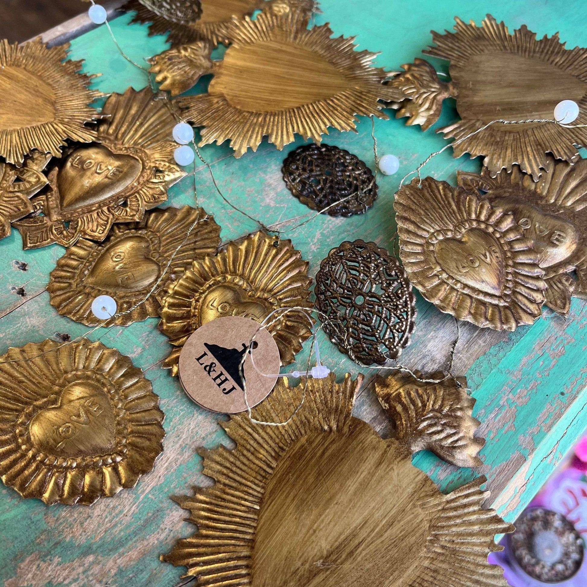 This 62-inch wired Sacred Heart Garland, hand-hammered from metal, provides a sturdy and beautiful solution for those seeking meaningful decor that stays in place and enhances any room in your home.
