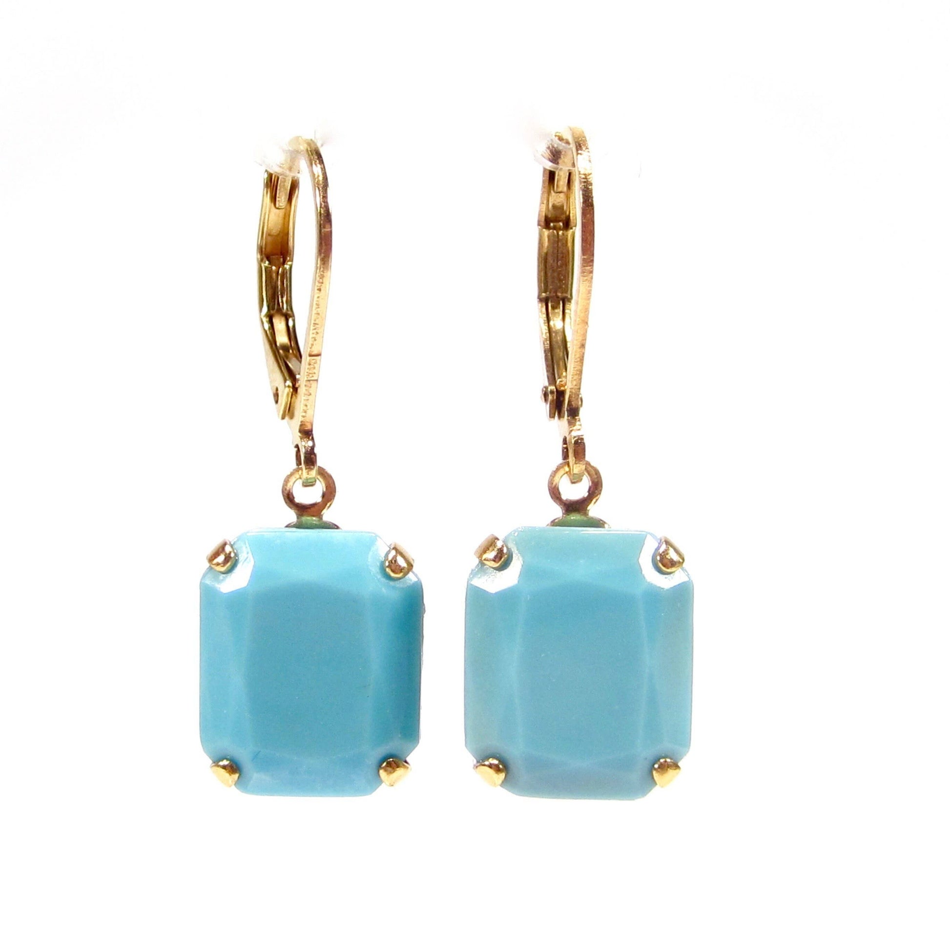 Stunning turquoise earrings. Handcrafted in Cologne, the setting is made of genuine gold-plated tombac. The inserted stone is original German handmade glass from the 1960s.