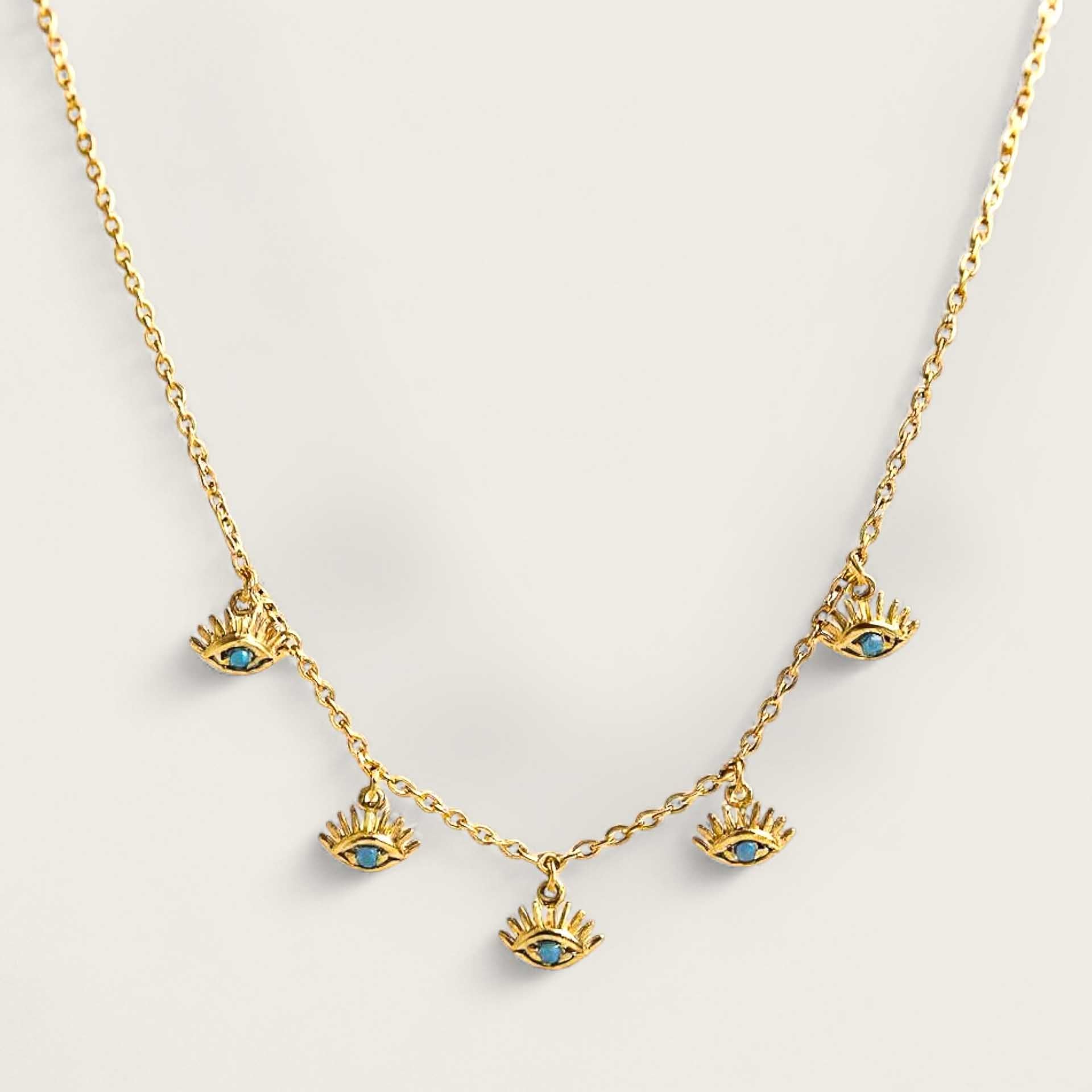 Experience calm and protection with this beautiful necklace, combining soothing turquoise gemstones and shining golden Evil Eye charms that reflect the peacefulness of clear waters and inspire your adventurous side. Five prominent Evil Eye beads draw the eye, offering a natural charm and a strong shield against negative energy. The warm gold details add a touch of elegance, making this necklace both versatile and eye-catching. Perfect for layering to create a relaxed, beach-inspired look or worn alone as a standout summer accessory. Crafted from gold-plated sterling silver with turquoise howlite stones, it measures 35.5cm with a 5cm extender for a comfortable fit.